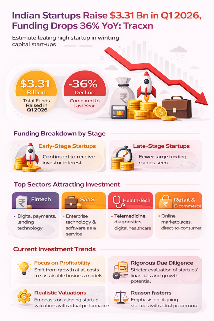The latest data from Tracxn shows that Indian startups raised $3.31 billion in Q1 2026, representing a 36% year-on-year decline in funding.