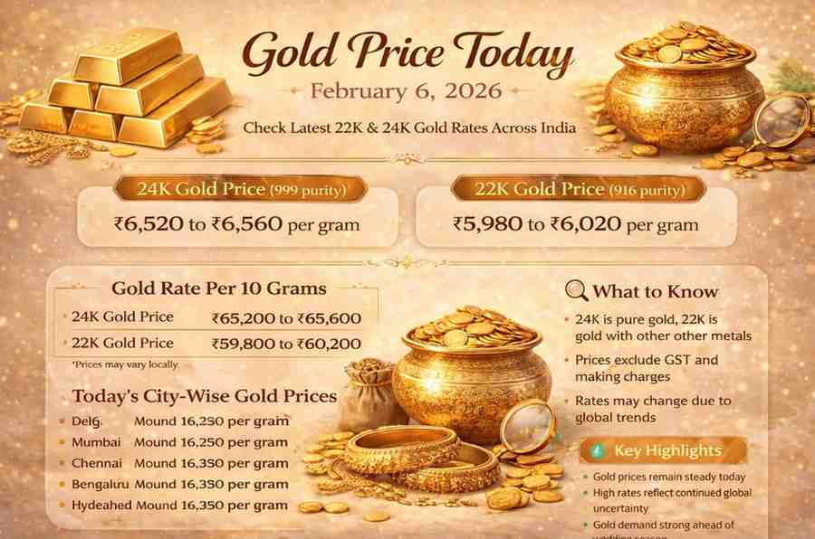 Gold prices in India on February 6, 2026 remain stable, with 22K and 24K rates showing minor day-to-day changes. Whether buying jewellery or investing, tracking daily prices and understanding purity can help make informed decisions.