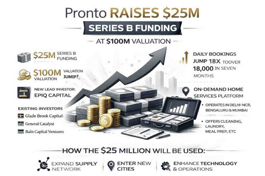 Bengaluru-based home services startup Pronto has raised $25 million in a Series B funding round, pushing its valuation to around $100 million. The investment marks a major milestone for the young company as it rapidly expands its on-demand household services platform across Indian cities.