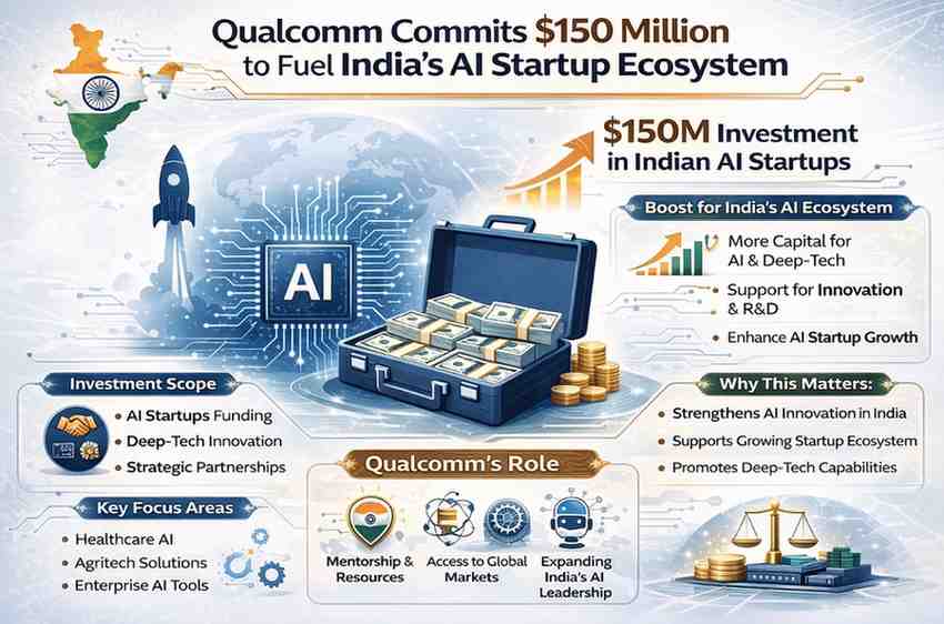 Global semiconductor leader Qualcomm has committed $150 million (approx. ₹1,200+ crore) to support India’s artificial intelligence startup ecosystem. The move signals growing global confidence in India’s AI potential and deep-tech talent.