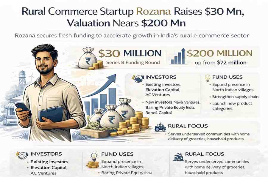 Rural commerce startup Rozana has raised $30 million in a new funding round, pushing its valuation close to $200 million and drawing fresh attention to India’s fast-growing rural retail market.