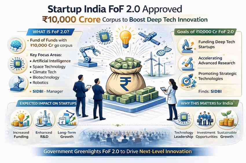 India’s startup ecosystem has received a major push with the approval of Startup India Fund of Funds 2.0 (FoF 2.0), backed by a corpus of ₹10,000 crore. The initiative is aimed at strengthening funding support for deep tech startups and accelerating innovation across critical technology sectors.